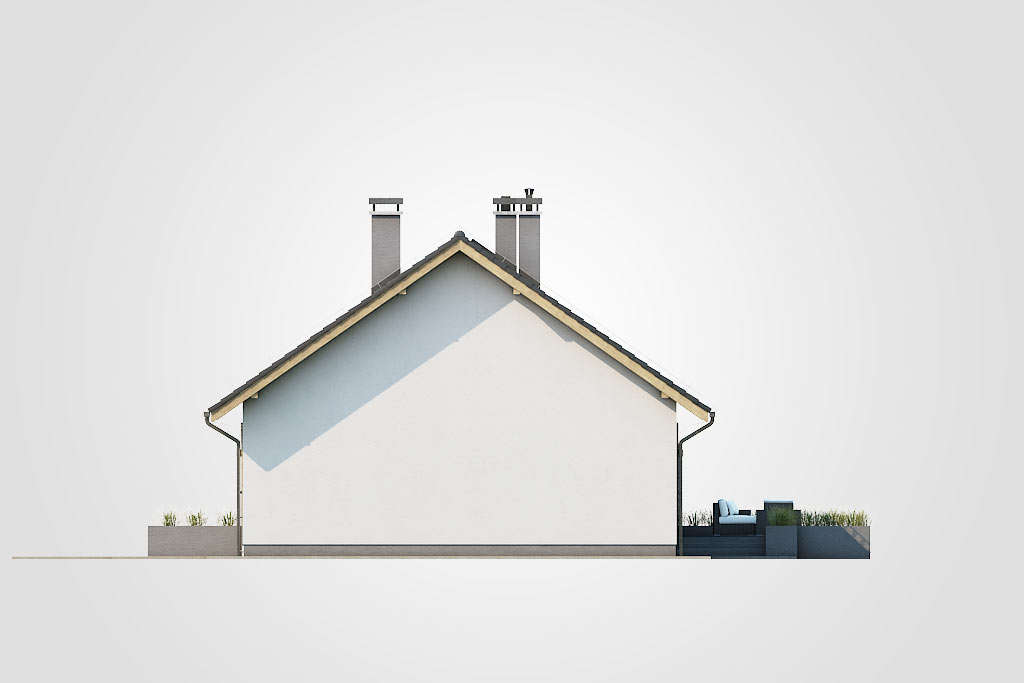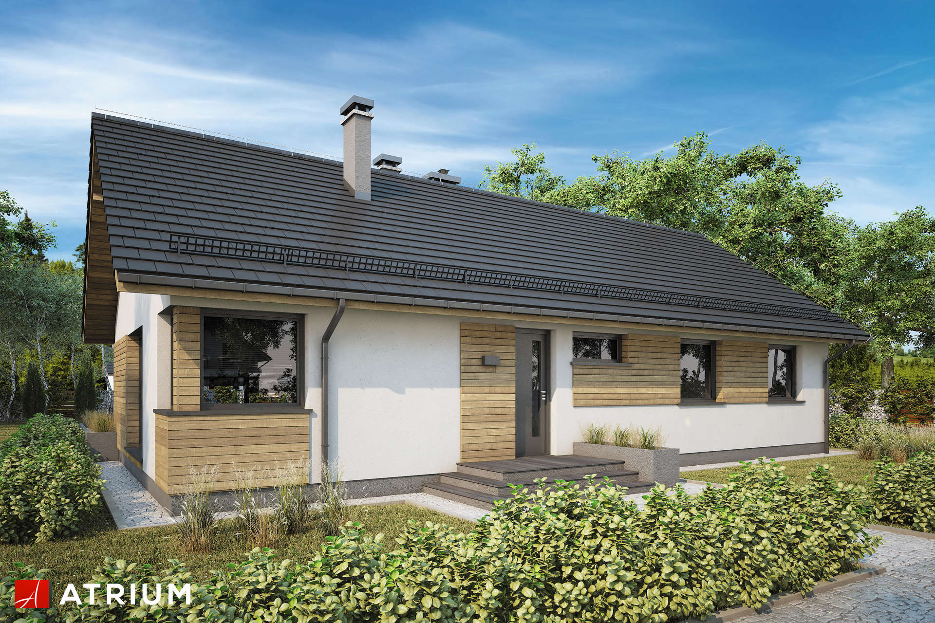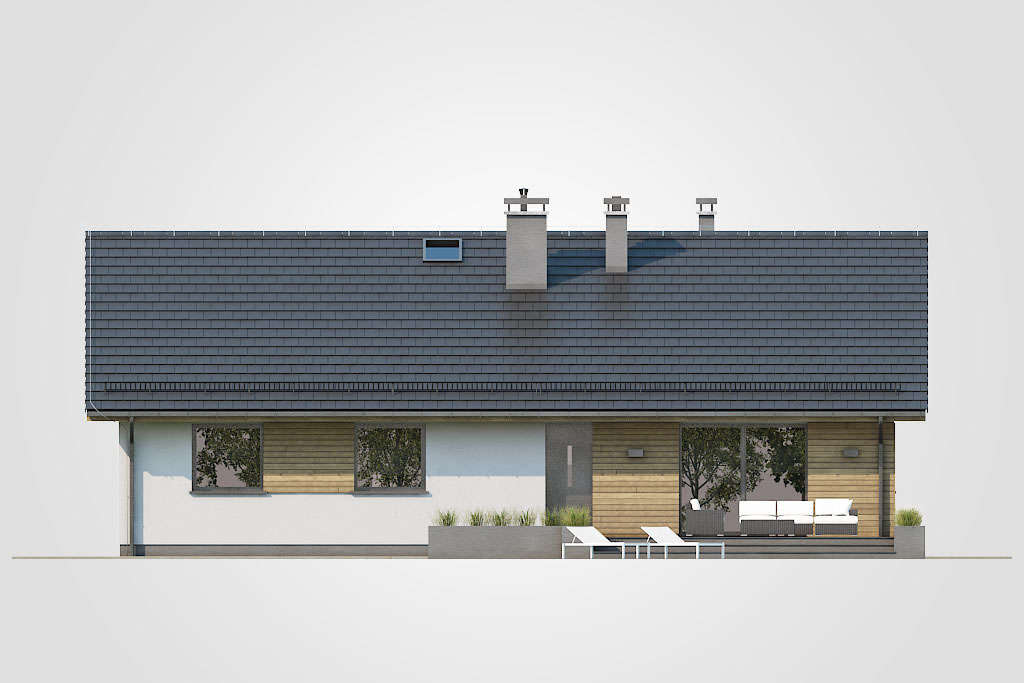 Projekt Aurora Maxi II BIS SZ to starannie przemyślany parterowy dom jednorodzinny w technologii szkieletowej o powierzchni użytkowej około 117 m² zaprojektowany przez Studio Atrium, idealny dla rodzin ceniących komfort mieszkania, funkcjonalne rozwiązania oraz estetykę nowoczesnej architektury. Poprzednik projektu - Aurora Maxi II SZ posiada dodatkowe zadaszenie tarasu, z którego w Aurorze Maxi II BIS SZ zrezygnowano. Bryła budynku powstała na planie prostokąta i zwieńczona jest klasycznym dwuspadowym dachem o kącie nachylenia 35°, co nie tylko podkreśla jego proporcje, ale także redukuje koszty budowy. Elewacja domu łączy ze sobą harmonijne zestawienie bieli, grafitu i elementów w ciepłym odcieniu drewna, co nadaje mu ponadczasowego, a zarazem bardzo naturalnego charakteru odpowiadającego trendom nowoczesnej architektury w stylu stodoły - prosty dach, czytelna forma i subtelna ornamentyka materiałów sprawiają, że dom świetnie prezentuje się zarówno w zabudowie podmiejskiej, jak i w miejskim otoczeniu. Technologia, w której zaprojektowano Aurora Maxi II BIS SZ, to lekka konstrukcja szkieletowa drewniana, z wykorzystaniem ścian z ociepleniem z wełny mineralnej, płyt OSB i dodatkową izolacją w systemie Termo Organika, co przekłada się na bardzo dobre parametry termoizolacyjne i niskie koszty ogrzewania przy zachowaniu wysokiego komfortu użytkowania. Dzięki temu rozwiązaniu dom jest nie tylko energooszczędny, ale też łatwy i szybki w realizacji, a sama konstrukcja daje wiele możliwości adaptacji wnętrza zgodnie z potrzebami mieszkańców. Wnętrze domu zostało podzielone na wyraźnie odrębne strefy funkcjonalne: dzienną i nocną - co zapewnia wygodę codziennego życia i możliwość spokojnego wypoczynku nawet przy licznej rodzinie. Do strefy dziennej należy przestronny pokój dzienny połączony z jadalnią i kuchnią, który stwarza otwartą, świetlistą przestrzeń sprzyjającą wspólnemu spędzaniu czasu, rozmowom oraz organizowaniu rodzinnych spotkań. Duże przeszklenie w salonie prowadzi na zadaszony taras, pozwalając płynnie łączyć przestrzeń wewnętrzną z ogrodową oraz zapewniając naturalne doświetlenie wnętrza. Kuchnia została zaprojektowana z myślą o funkcjonalności i ułatwieniu codziennych czynności, a przylegająca do niej spiżarnia oferuje dodatkowe miejsce do przechowywania artykułów spożywczych czy sprzętów kuchennych - to rozwiązanie, które ułatwia utrzymanie porządku. W części nocnej znajdują się cztery komfortowe sypialnie - wystarczająca liczba pomieszczeń do wygodnego życia rodziny 2+2 lub 2+3, a także duża łazienka z oknem. W domu zaprojektowano przedsionek i hall, które tworzą praktyczną przestrzeń przejściową oraz służą jako bariera termiczna i akustyczna. Ważnym elementem użytkowym jest także obszerna kotłownia z osobnym wyjściem na zewnątrz, która może pełnić dodatkowe funkcje, jak np. pralnia czy schowek na narzędzia i sprzęt ogrodowy. Osobne pomieszczenie w.c. dopełnia program funkcjonalny domu i zwiększa wygodę jego użytkowników. Całość tworzy spójną, praktyczną i estetyczną przestrzeń mieszkalną, w której zastosowano zarówno klasyczne rozwiązania architektoniczne, jak i nowoczesne detale.