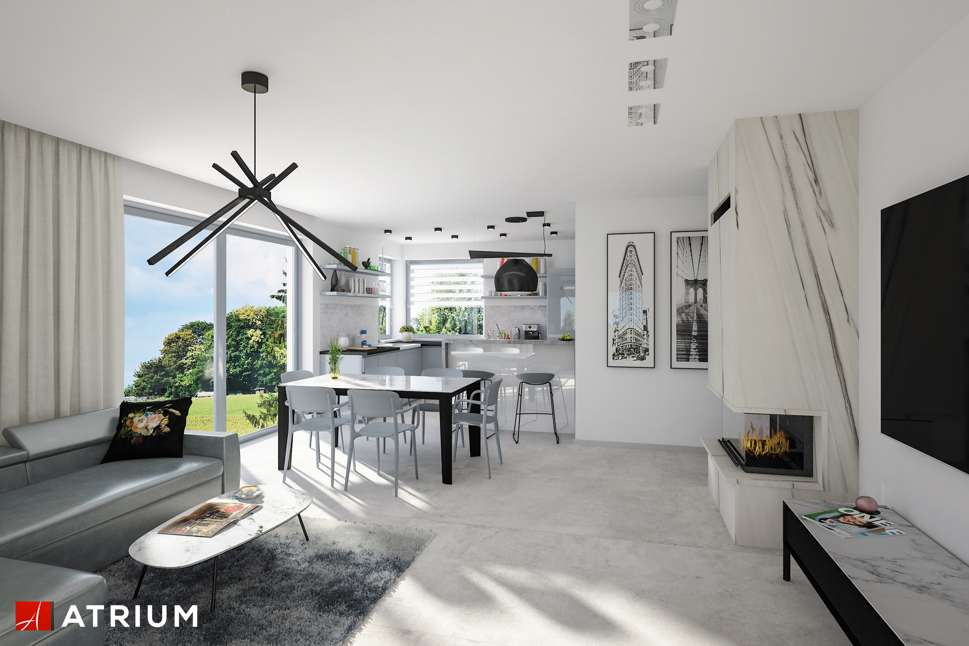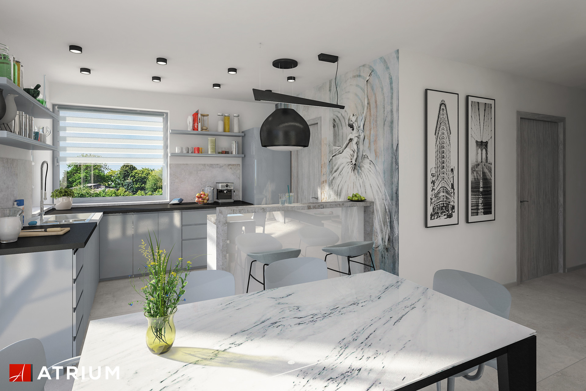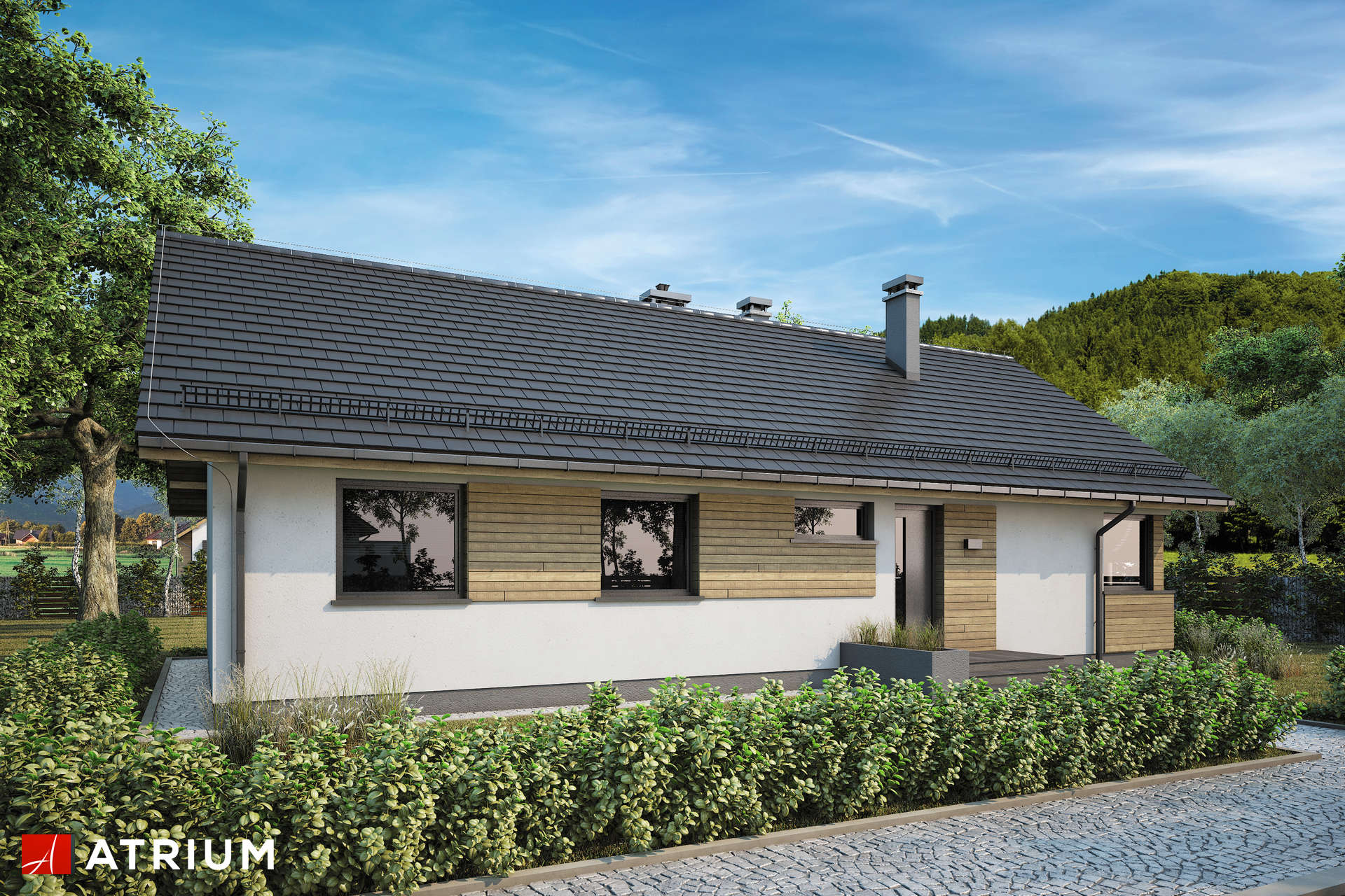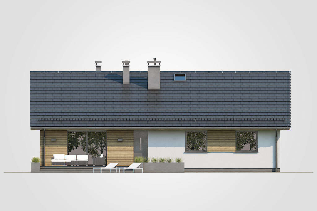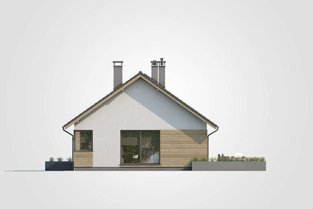 Projekt Aurora Maxi II BIS SZ to starannie przemyślany parterowy dom jednorodzinny w technologii szkieletowej o powierzchni użytkowej około 117 m² zaprojektowany przez Studio Atrium, idealny dla rodzin ceniących komfort mieszkania, funkcjonalne rozwiązania oraz estetykę nowoczesnej architektury. Poprzednik projektu - Aurora Maxi II SZ posiada dodatkowe zadaszenie tarasu, z którego w Aurorze Maxi II BIS SZ zrezygnowano. Bryła budynku powstała na planie prostokąta i zwieńczona jest klasycznym dwuspadowym dachem o kącie nachylenia 35°, co nie tylko podkreśla jego proporcje, ale także redukuje koszty budowy. Elewacja domu łączy ze sobą harmonijne zestawienie bieli, grafitu i elementów w ciepłym odcieniu drewna, co nadaje mu ponadczasowego, a zarazem bardzo naturalnego charakteru odpowiadającego trendom nowoczesnej architektury w stylu stodoły - prosty dach, czytelna forma i subtelna ornamentyka materiałów sprawiają, że dom świetnie prezentuje się zarówno w zabudowie podmiejskiej, jak i w miejskim otoczeniu. Technologia, w której zaprojektowano Aurora Maxi II BIS SZ, to lekka konstrukcja szkieletowa drewniana, z wykorzystaniem ścian z ociepleniem z wełny mineralnej, płyt OSB i dodatkową izolacją w systemie Termo Organika, co przekłada się na bardzo dobre parametry termoizolacyjne i niskie koszty ogrzewania przy zachowaniu wysokiego komfortu użytkowania. Dzięki temu rozwiązaniu dom jest nie tylko energooszczędny, ale też łatwy i szybki w realizacji, a sama konstrukcja daje wiele możliwości adaptacji wnętrza zgodnie z potrzebami mieszkańców. Wnętrze domu zostało podzielone na wyraźnie odrębne strefy funkcjonalne: dzienną i nocną - co zapewnia wygodę codziennego życia i możliwość spokojnego wypoczynku nawet przy licznej rodzinie. Do strefy dziennej należy przestronny pokój dzienny połączony z jadalnią i kuchnią, który stwarza otwartą, świetlistą przestrzeń sprzyjającą wspólnemu spędzaniu czasu, rozmowom oraz organizowaniu rodzinnych spotkań. Duże przeszklenie w salonie prowadzi na zadaszony taras, pozwalając płynnie łączyć przestrzeń wewnętrzną z ogrodową oraz zapewniając naturalne doświetlenie wnętrza. Kuchnia została zaprojektowana z myślą o funkcjonalności i ułatwieniu codziennych czynności, a przylegająca do niej spiżarnia oferuje dodatkowe miejsce do przechowywania artykułów spożywczych czy sprzętów kuchennych - to rozwiązanie, które ułatwia utrzymanie porządku. W części nocnej znajdują się cztery komfortowe sypialnie - wystarczająca liczba pomieszczeń do wygodnego życia rodziny 2+2 lub 2+3, a także duża łazienka z oknem. W domu zaprojektowano przedsionek i hall, które tworzą praktyczną przestrzeń przejściową oraz służą jako bariera termiczna i akustyczna. Ważnym elementem użytkowym jest także obszerna kotłownia z osobnym wyjściem na zewnątrz, która może pełnić dodatkowe funkcje, jak np. pralnia czy schowek na narzędzia i sprzęt ogrodowy. Osobne pomieszczenie w.c. dopełnia program funkcjonalny domu i zwiększa wygodę jego użytkowników. Całość tworzy spójną, praktyczną i estetyczną przestrzeń mieszkalną, w której zastosowano zarówno klasyczne rozwiązania architektoniczne, jak i nowoczesne detale.