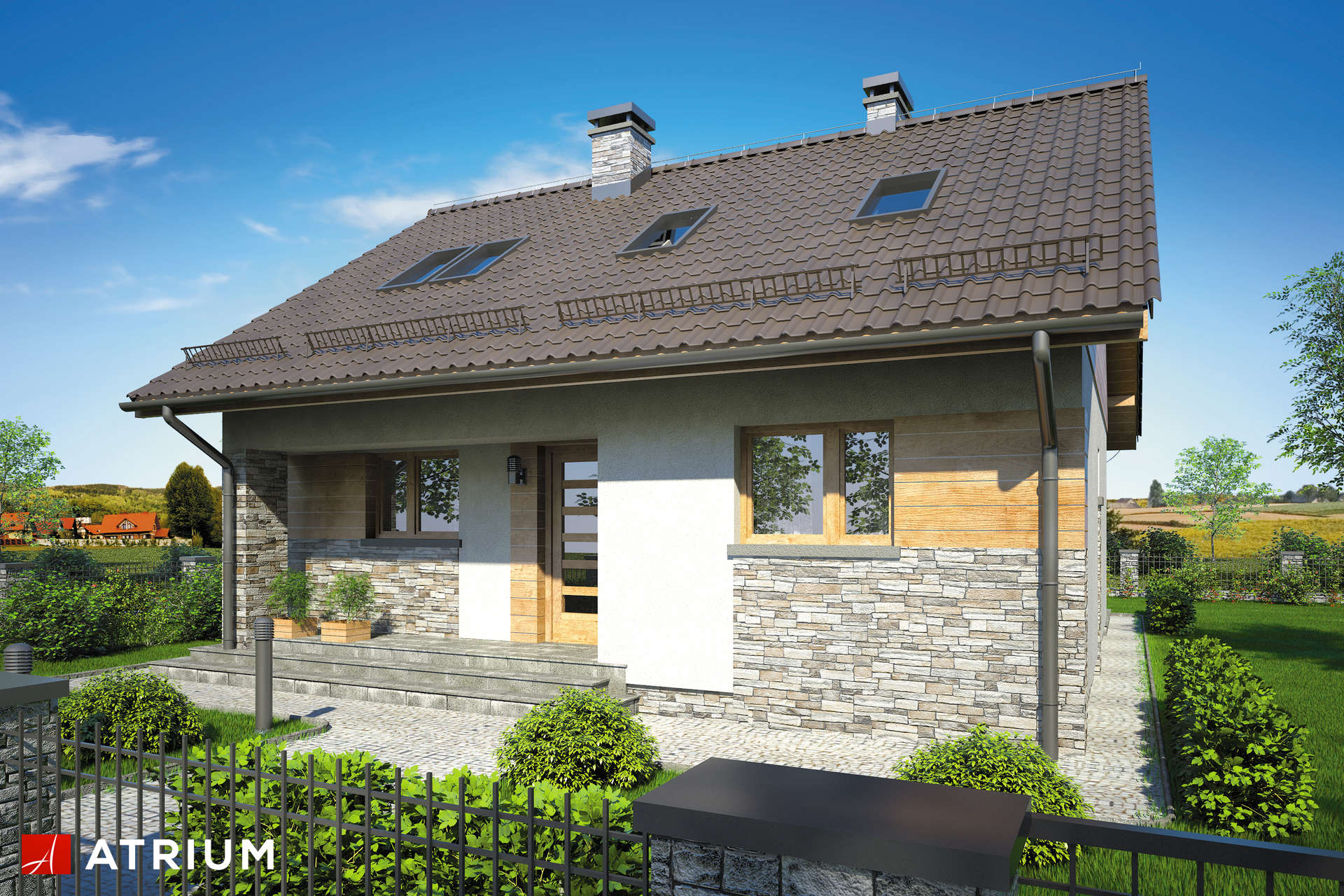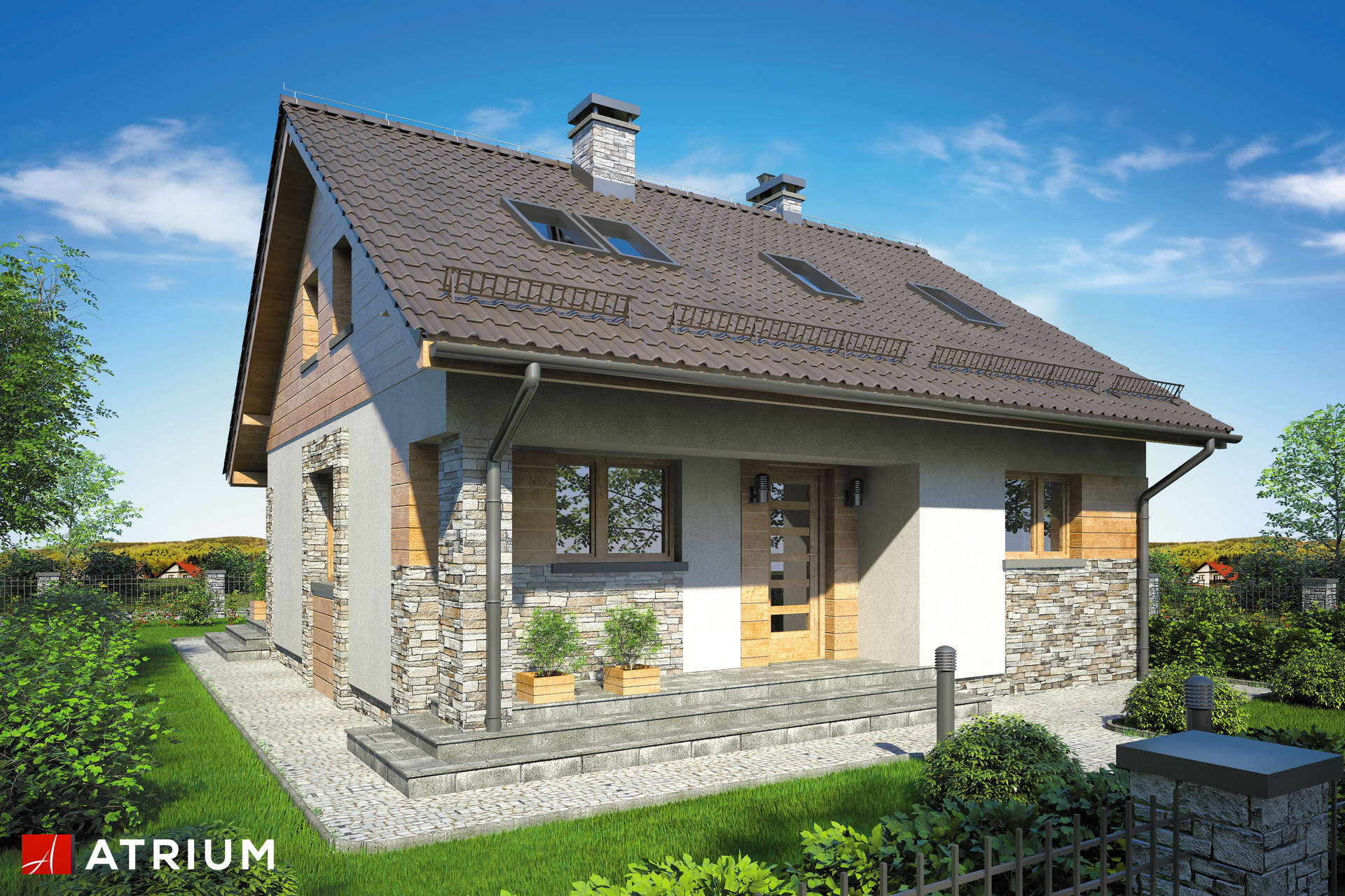 Typowy, posadowiony na planie prostokąta budynek parterowy z poddaszem użytkowym, zyskuje nowe oblicze dzięki drewnianym i kamiennym elementom elewacji, a całości dopełnia ciepły odcień dachówki. Wnętrze budynku o powierzchni niespełna 100 m2 mieści cztery niezależne pokoje, dwie łazienki oraz obszerny pokój dzienny otwarty na jadalnię i kuchnię. Warto zwrócić uwagę na dodatkową powierzchnię gospodarczą, czyli garderobę na poddaszu oraz praktyczny przedsionek z wnękami pod zabudowę. Dom przykryto dwuspadowym dachem.