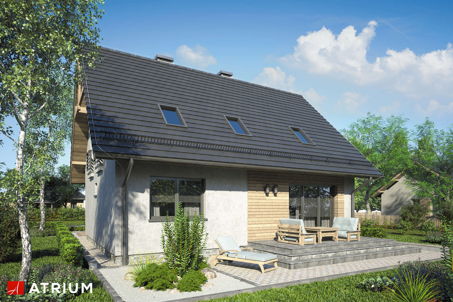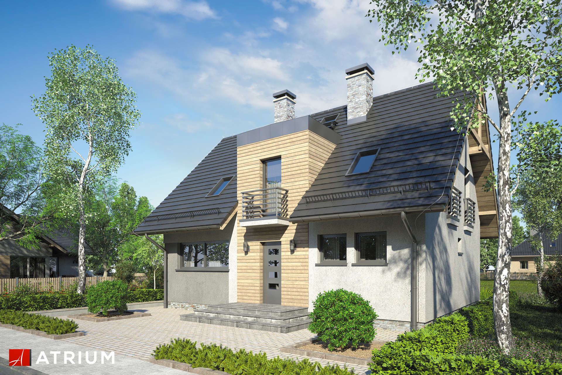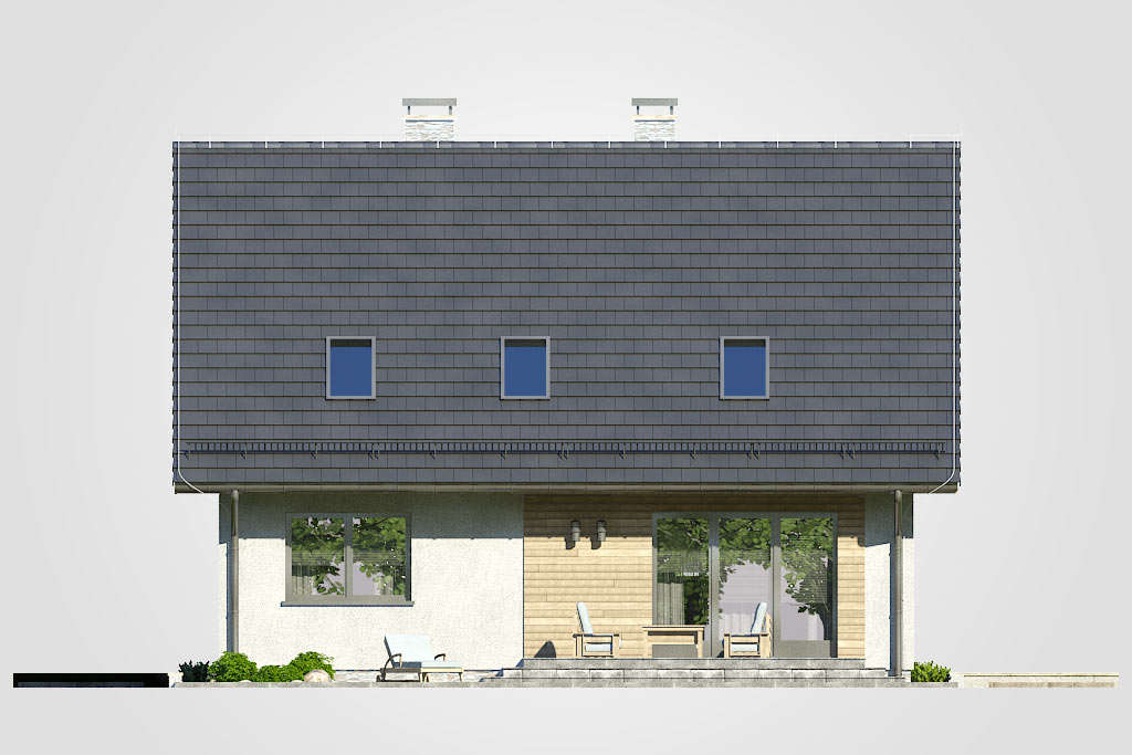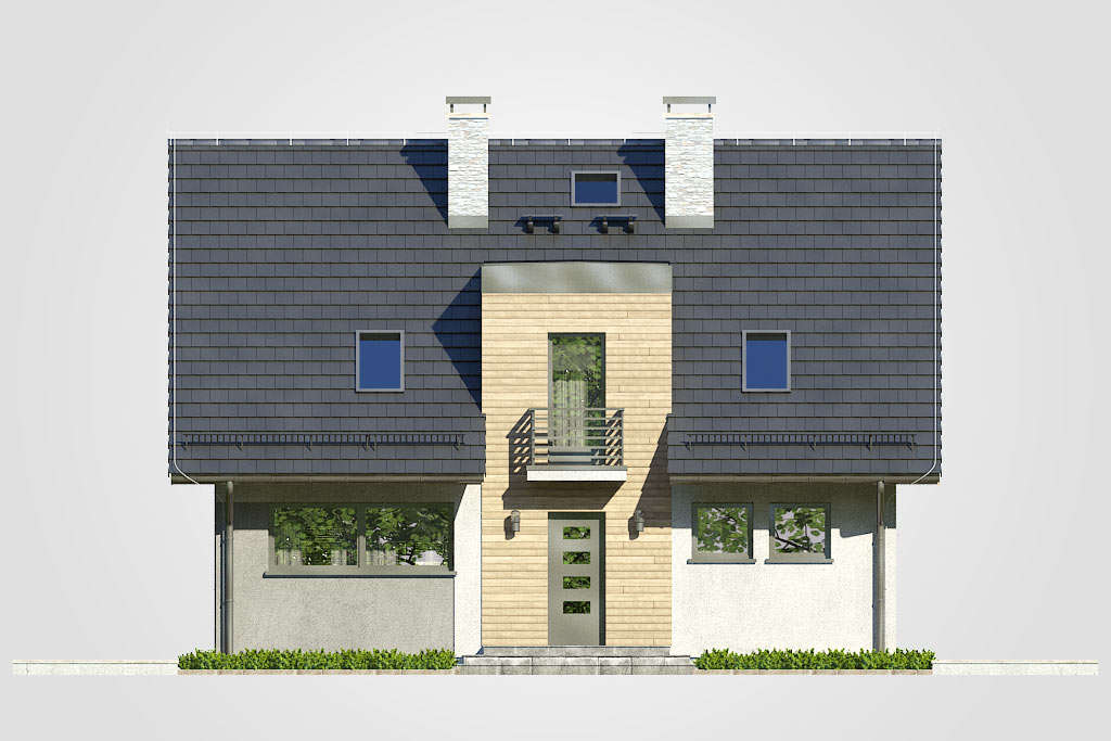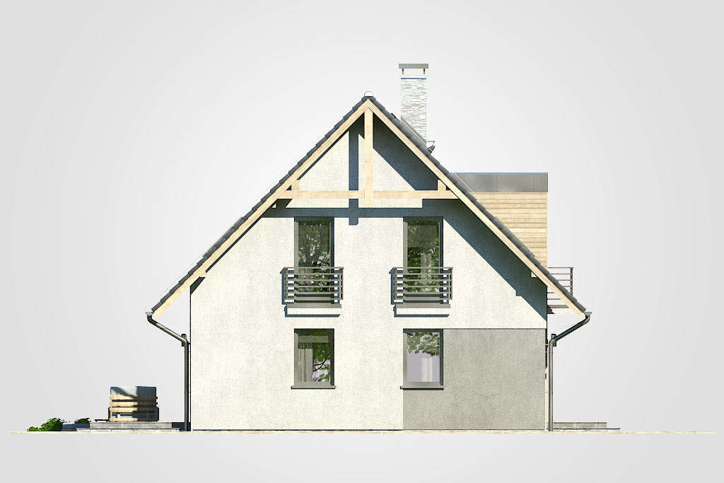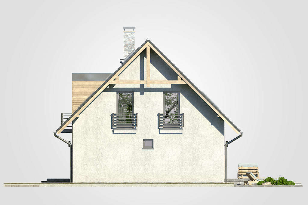 Oryginalny kształt budynku sprawia, że ta bryła z pewnością wyróżni się wśród innych. Użytkowe poddasze składające się z czterech sypialni i łazienki sprawia, że dom doskonale sprawdzi się dla rodzin pięcioosobowych lub większych dzięki dodatkowemu pokojowi na parterze. Duży przedsionek, szeroki hall z komunikacją oraz otwarta przestrzeń dzienna gwarantują dużą wygodę użytkowania.